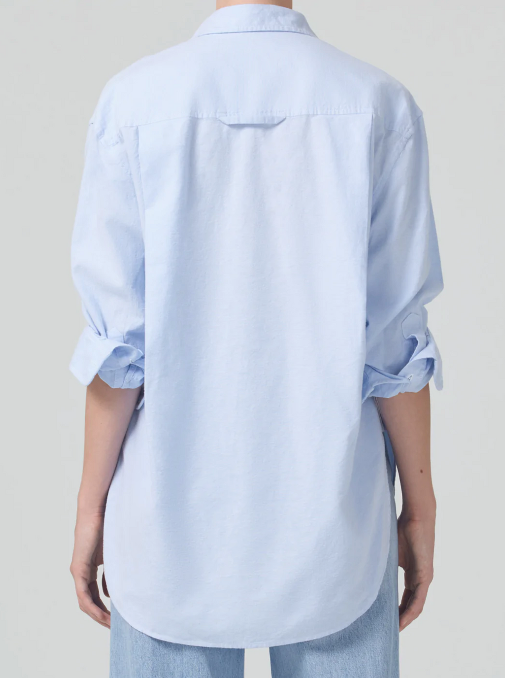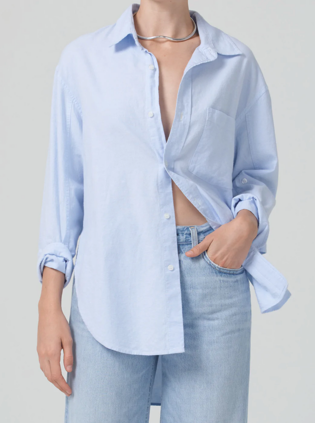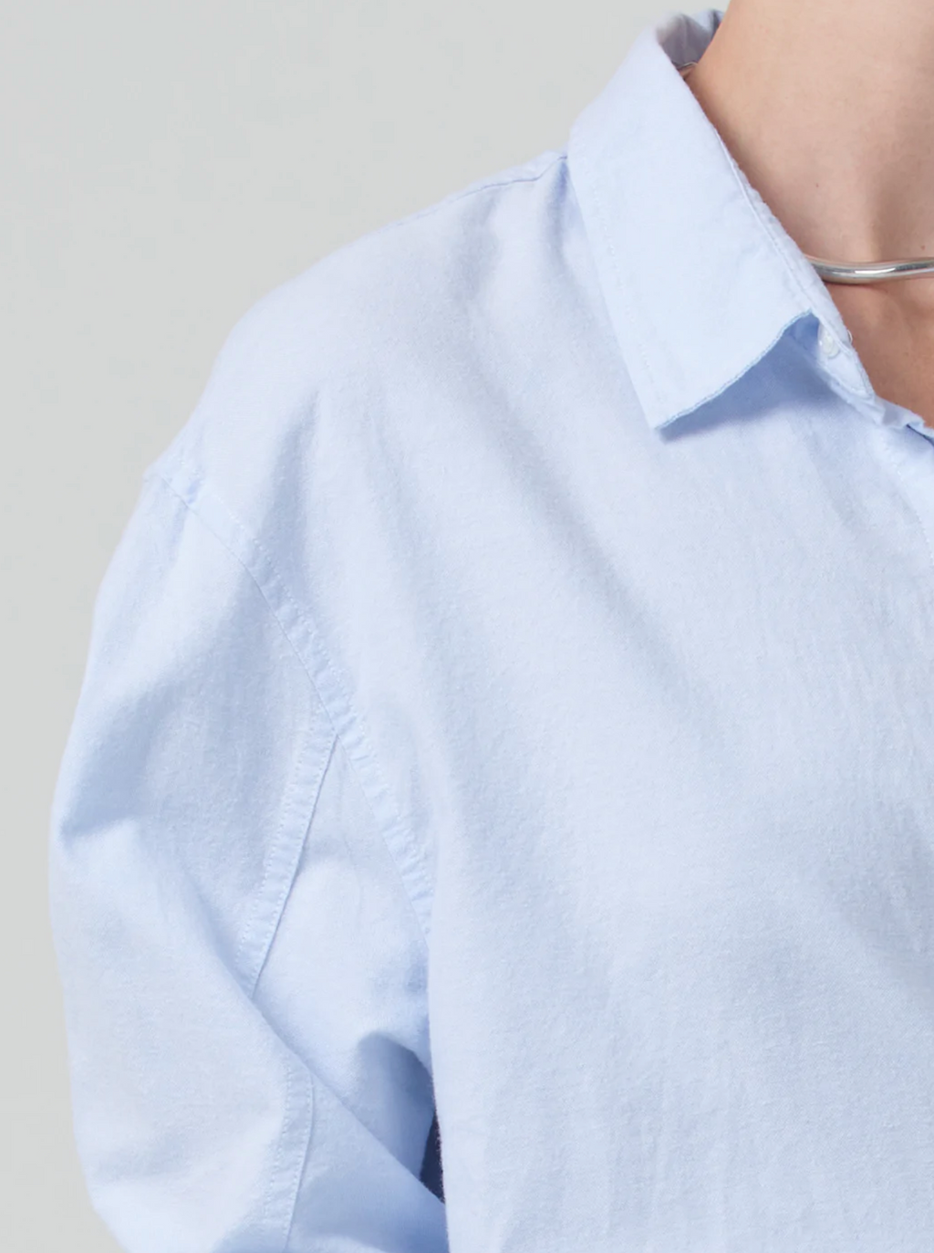 Soft, pale blue poplin long sleeve button front collared shirt