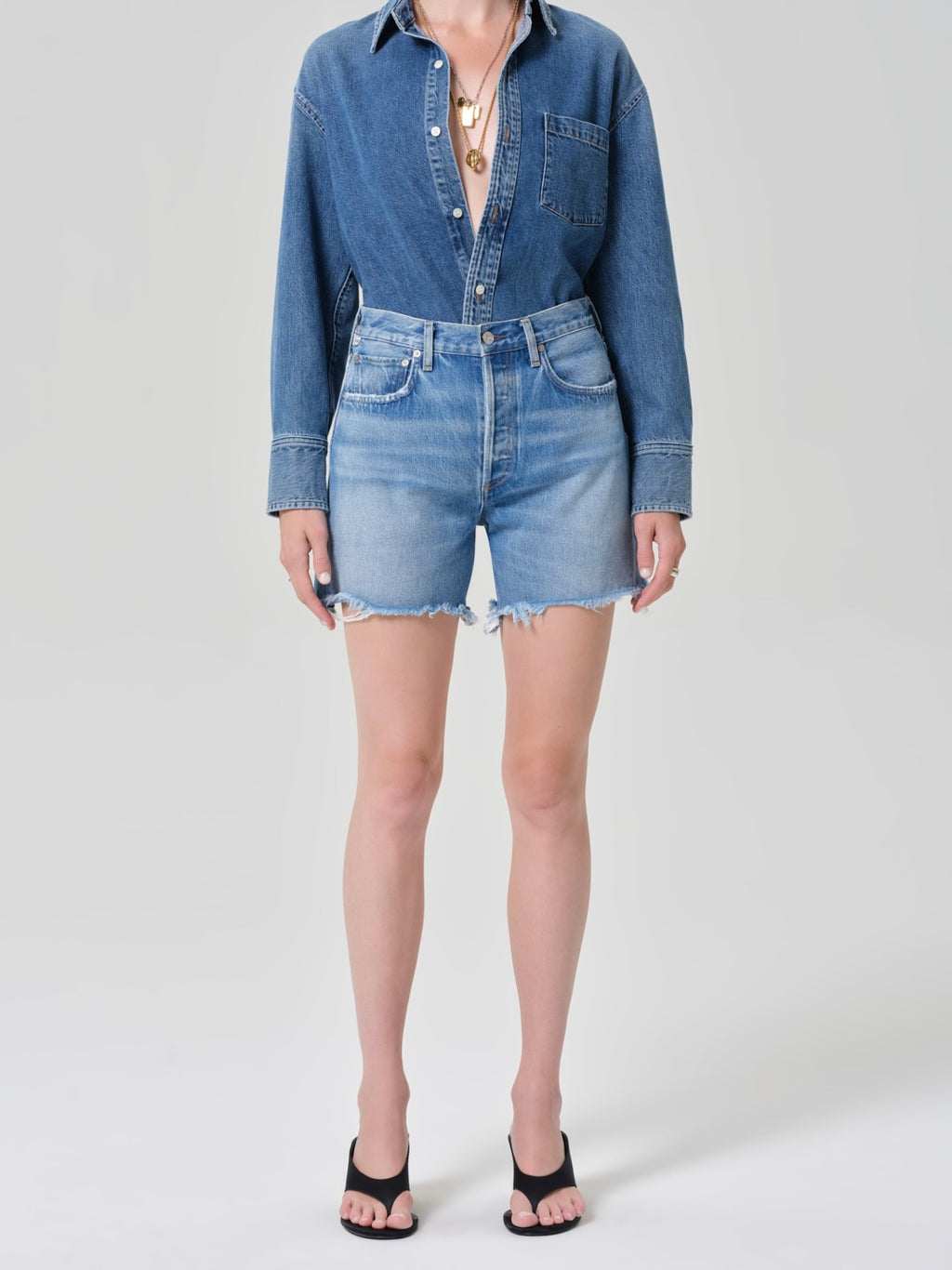 Light to medium indigo denim short with raw hem.