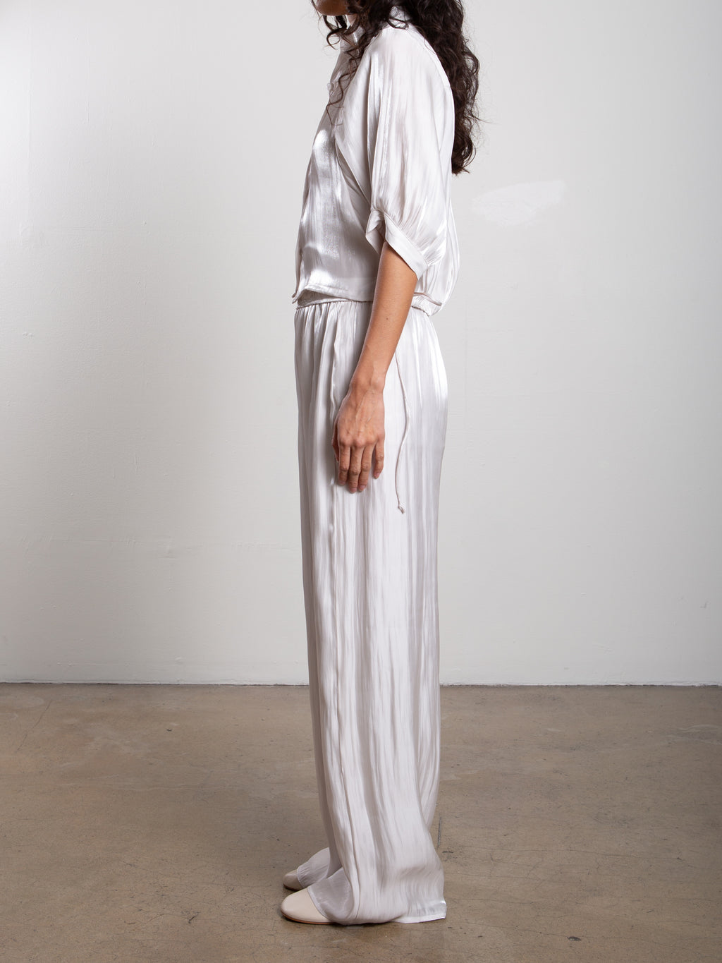 Wide-leg pant with forward seams and hidden pockets. Fully elasticized waist. Crinkle fabric with soft shine.