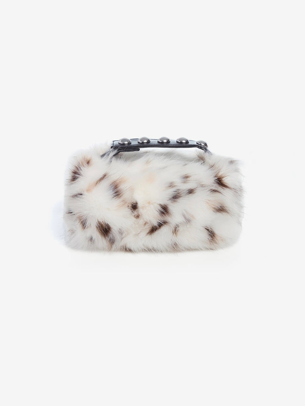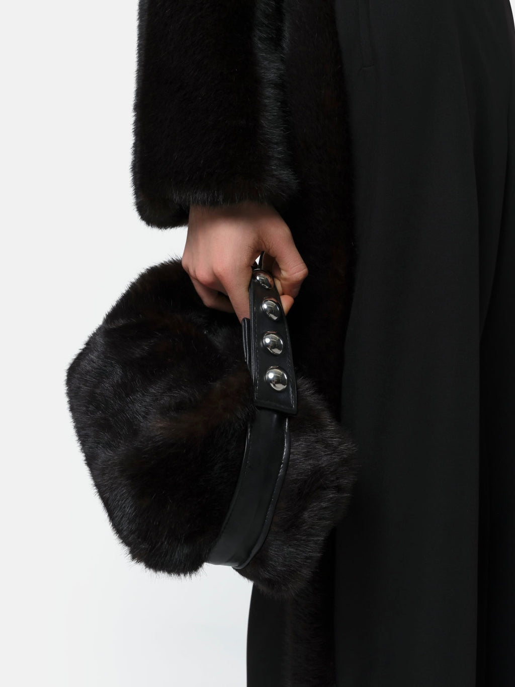 Recycled faux shaved mink fur with a 100% recycled poly lining & partially recycled, custom metal trims.