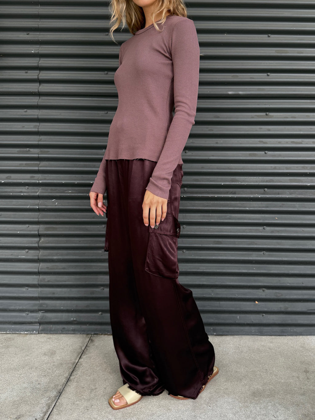 Mason blends a utilitarian feel with lux Vintage Satin for an elevated take on the cargo silhouette. This pant is full length with wide legs and angled side cargo pockets.