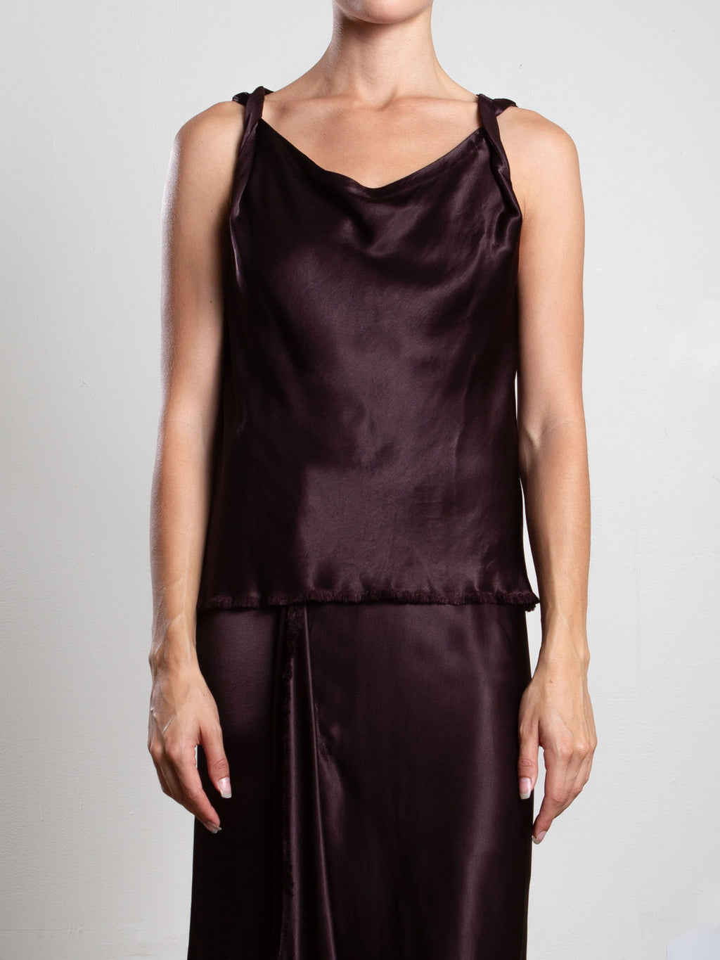 Softly draped with a twisted shoulder and gentle cowl, the Paloma is cut on the bias for an effortless fit. She's the ideal date night top—elevated yet easy, whether paired with denim or worn as a matching set.