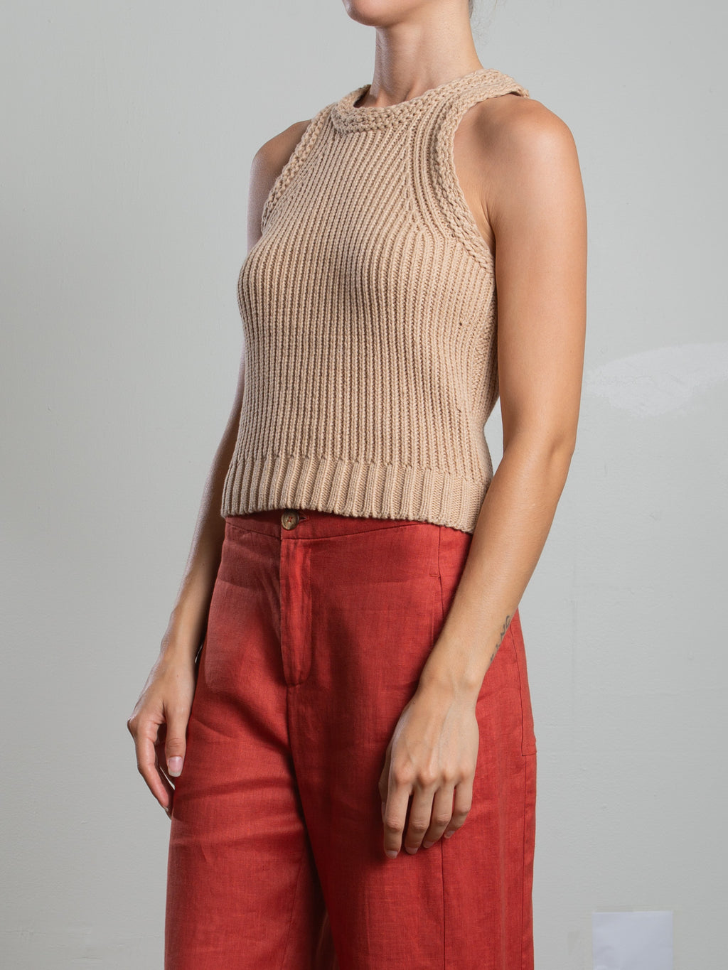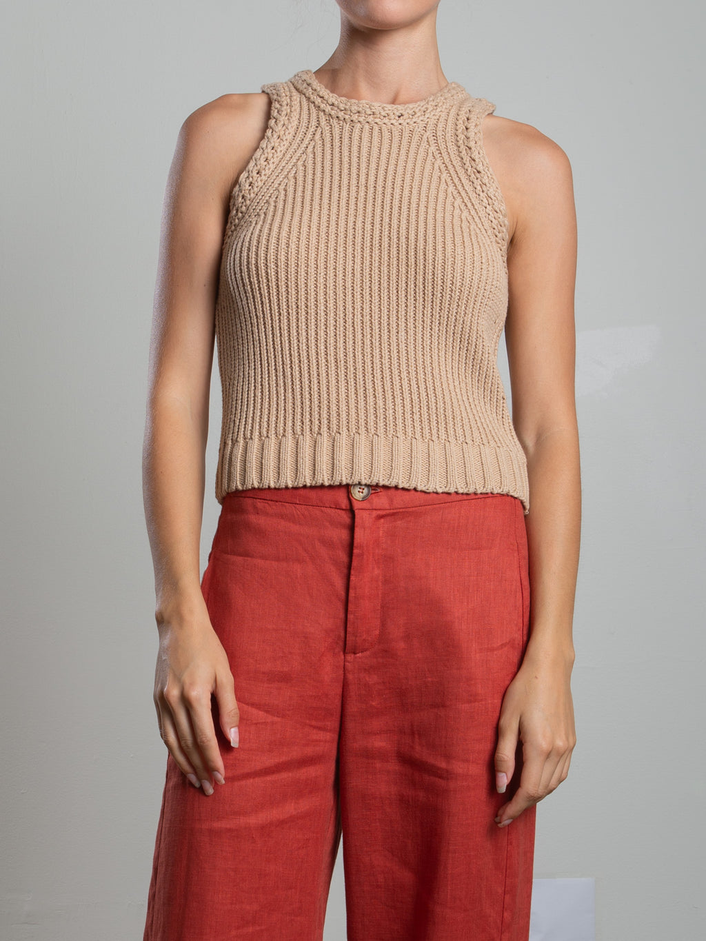 Hi-neck tank with crochet accents and side slits.