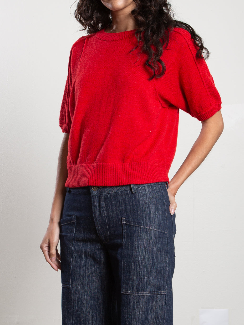 Short sleeve crewneck sweater with novelty shoulder stitch and exposed seam details.