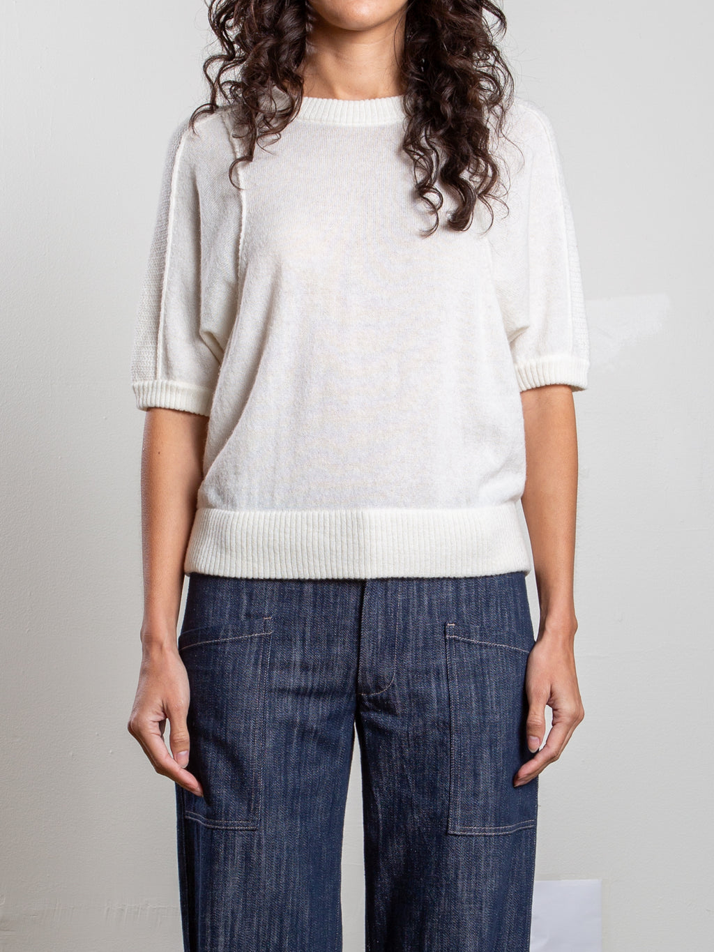 Short sleeve crewneck sweater with novelty shoulder stitch and exposed seam details.