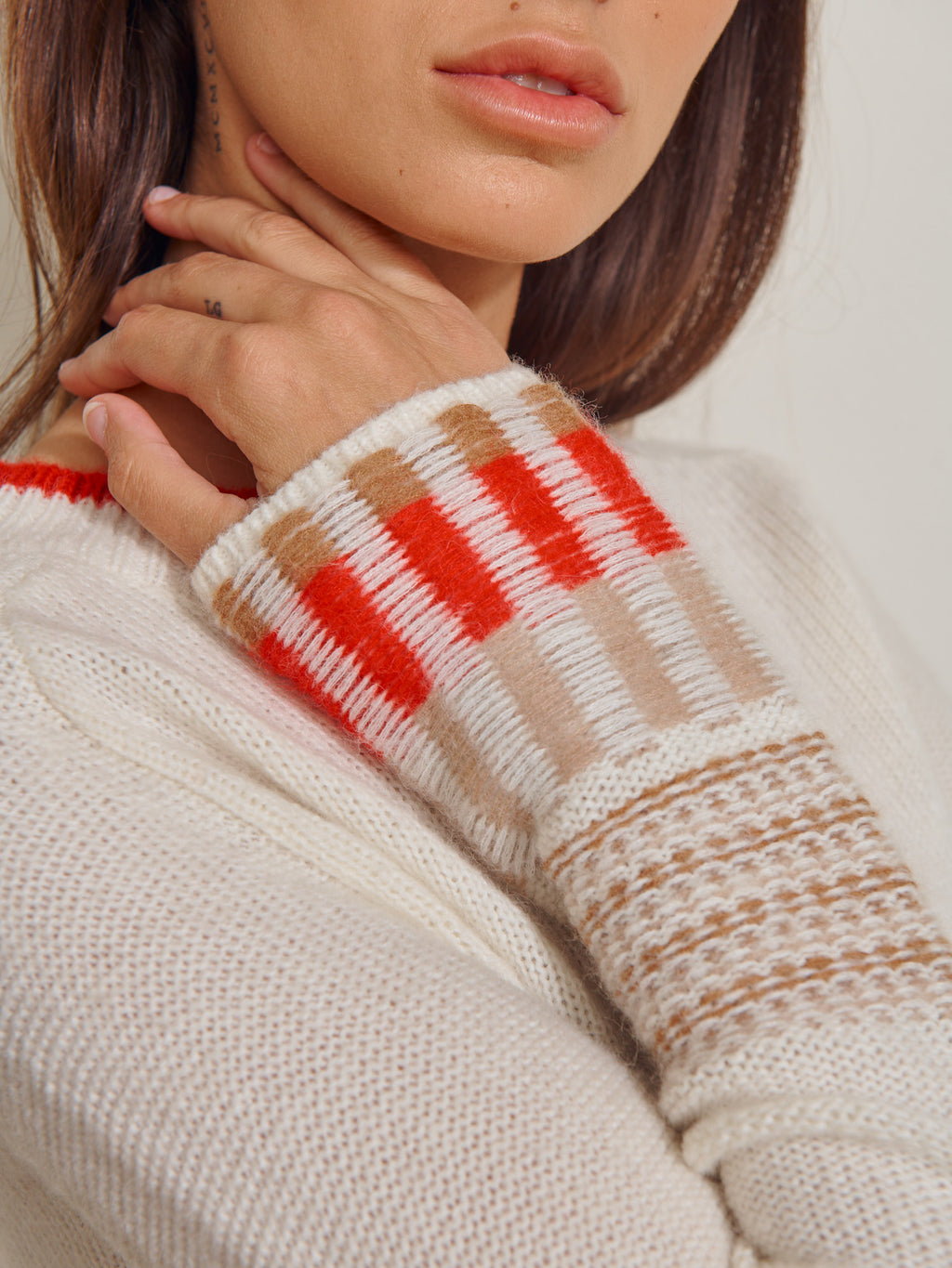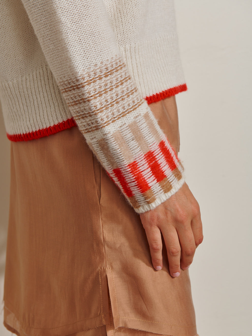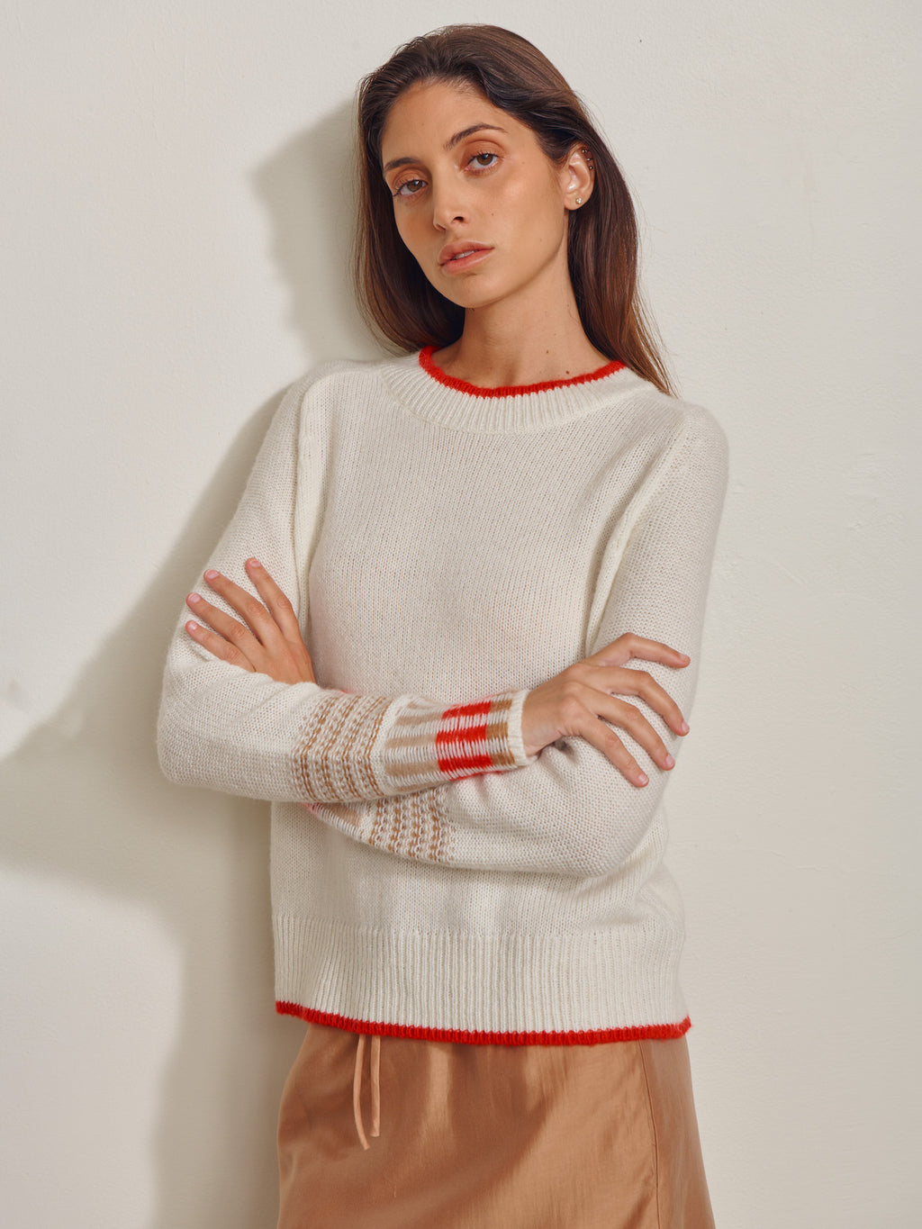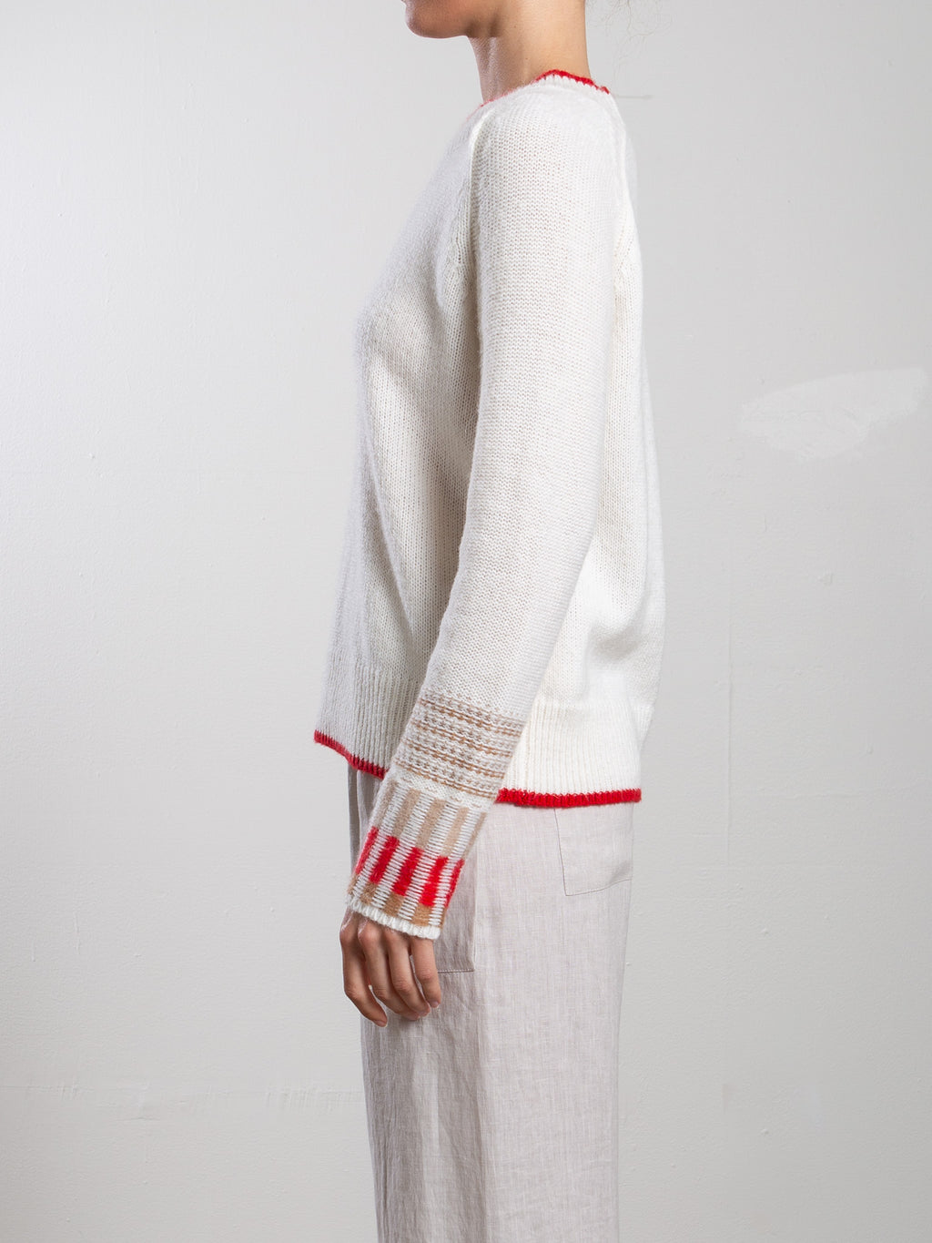 Crewneck sweater with novelty stitch at sleeve cuffs. Features contrast piping at neck and hem.