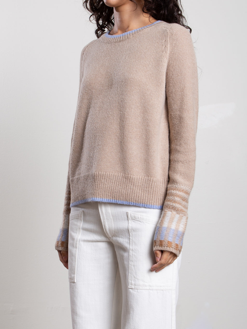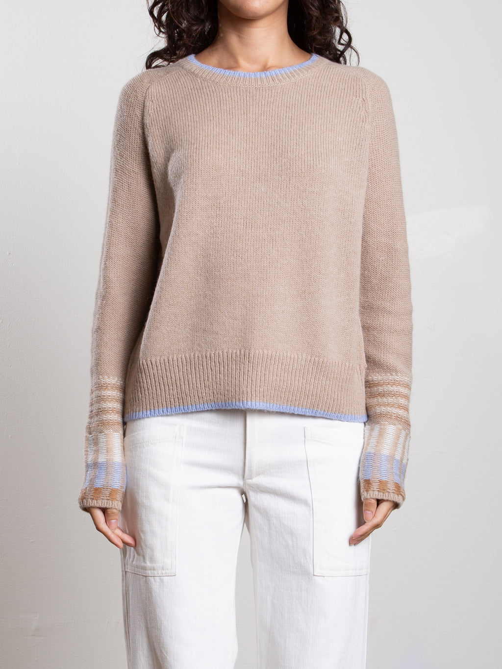 Crewneck sweater with novelty stitch at sleeve cuffs. Features contrast piping at neck and hem.