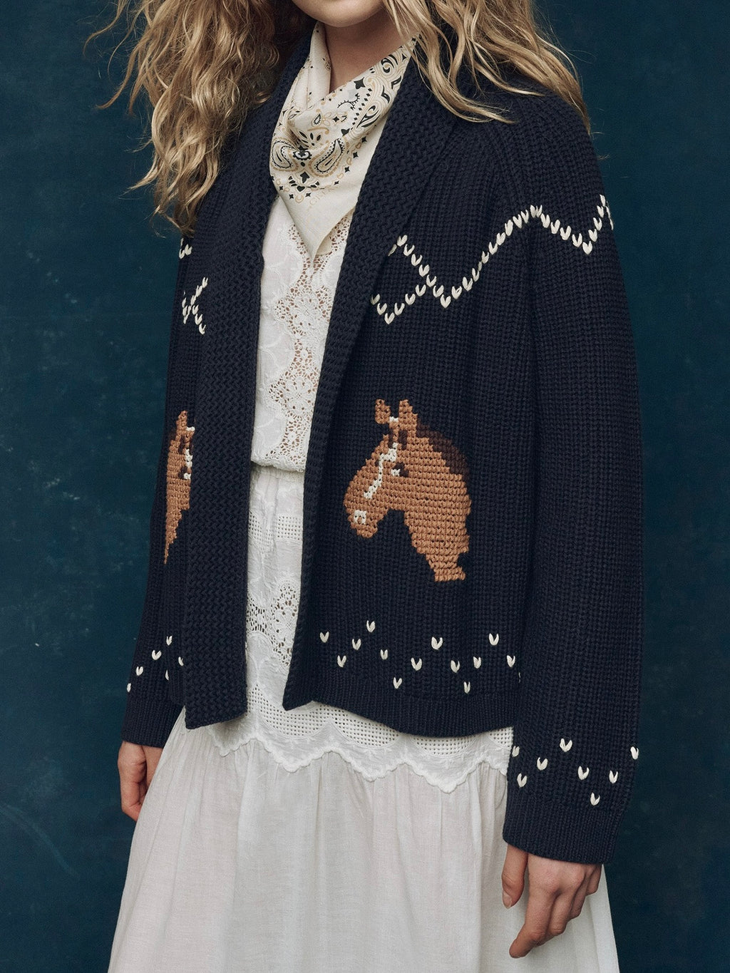Inspired by a beloved 1960s children’s sweater, The Horse Lodge Cardigan brings a sense of western nostalgia to our best-selling Lodge silhouette. Hand-embroidered horses add a charming, heritage touch, while a soft cotton-blend yarn keeps the feel easy and wearable. Designed with intentional ease through the body, it layers effortlessly for everyday comfort. Size down for a closer fit, or wear true for that relaxed, borrowed-from-the-past feel.
