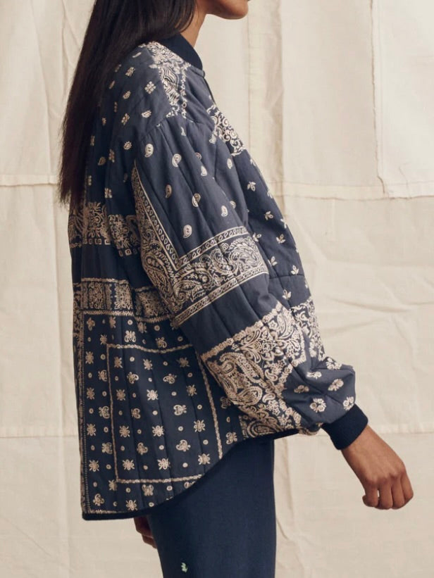 The Quilted Bomber revisits a classic bomber silhouette, cut in the season’s Bandana Print—a longstanding motif within the collection. The style features hand pockets, rib-knit cuffs, a high–low curved hem, and a metal zip closure.Cut with a generous proportion for ease and layering, the quilted construction offers lightweight warmth.