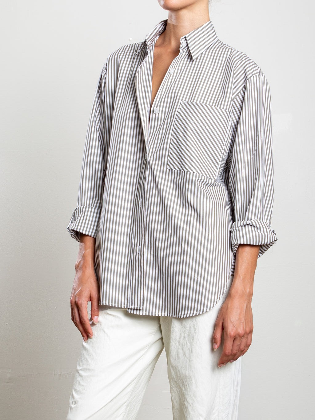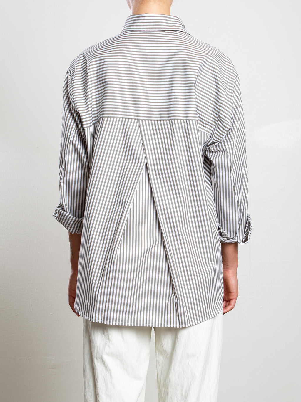 Oversized shirt with overlapping pleat detail in back. Also has an exaggerated gusset with a play on stripe direction.