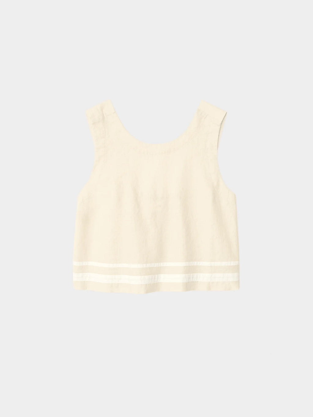 Vacation Mode. Leni is made in our new lightweight linen. Leni is a sleeveless top with a boxy fit, round neck, and contrast taping. Pair back with the Lucille Skirt or Pippen Pant for the ultimate soft tailored look.