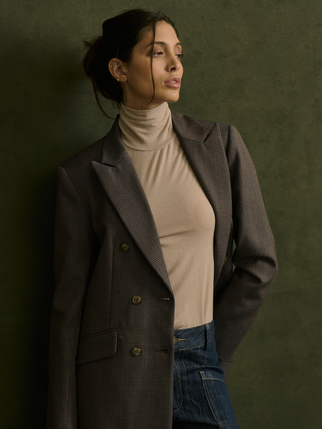 Cut in cashmere jersey, Maya is a sleeveless turtleneck designed to slip easily under blazers or stand alone for a streamlined look.