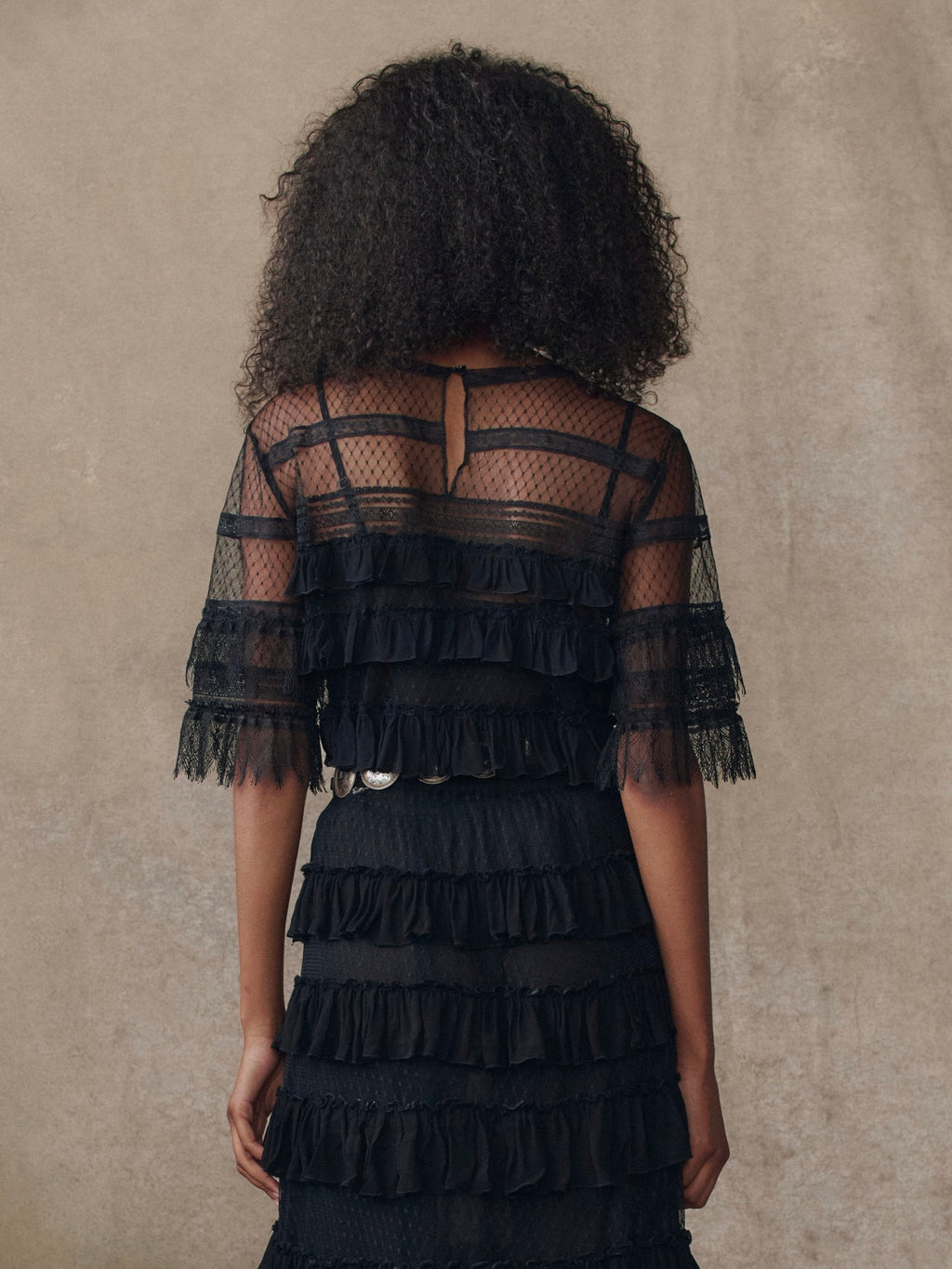 Whimsical and light, these top layers dotted mesh, bobbin lace, and tiers of soft georgette ruffles for a vintage-inspired feel. With delicate edges and a loose, boxy shape, it moves beautifully with every step. Sheer and airy, it’s finished with a button closure at the back and comes with a separate camisole.