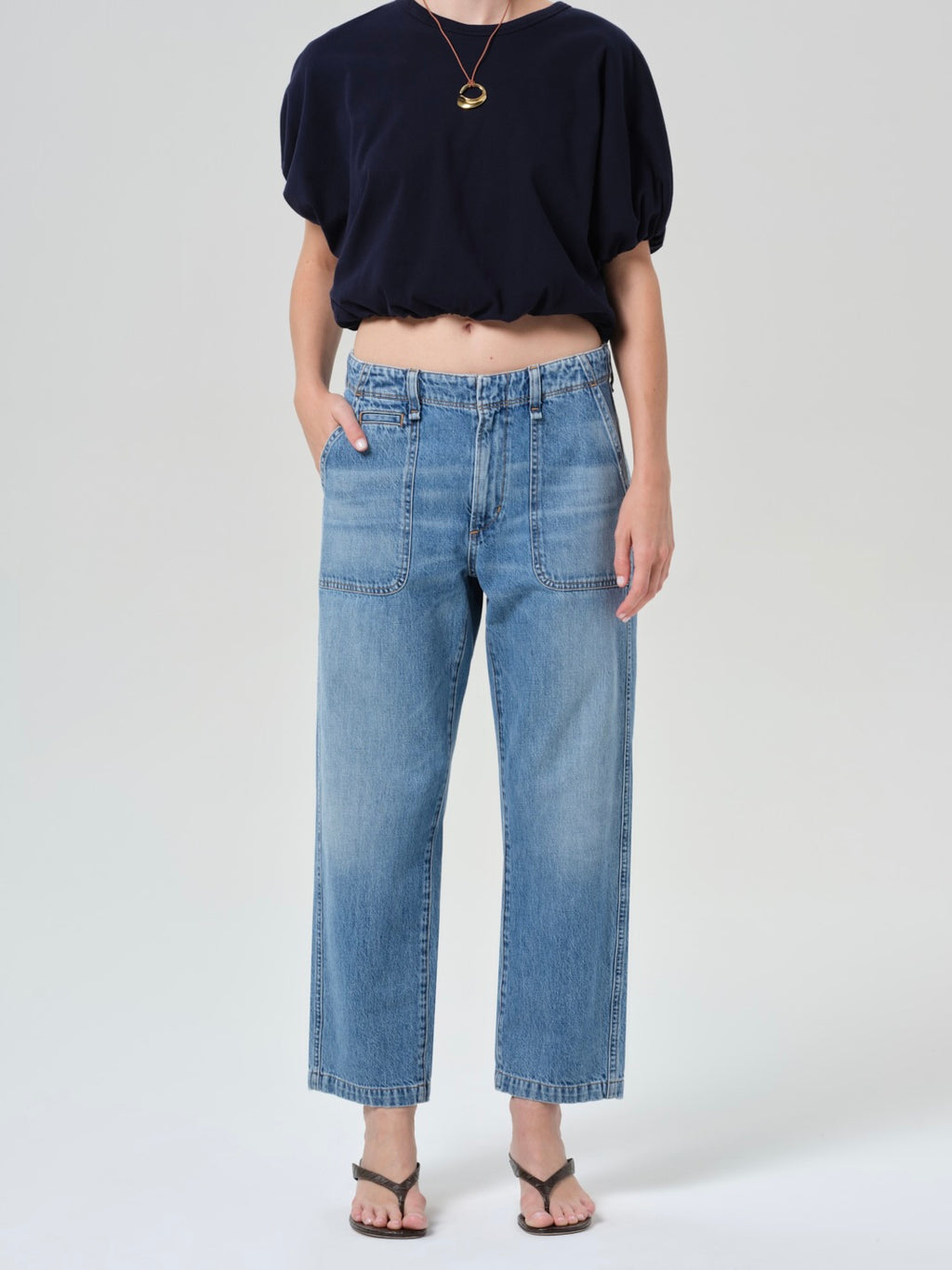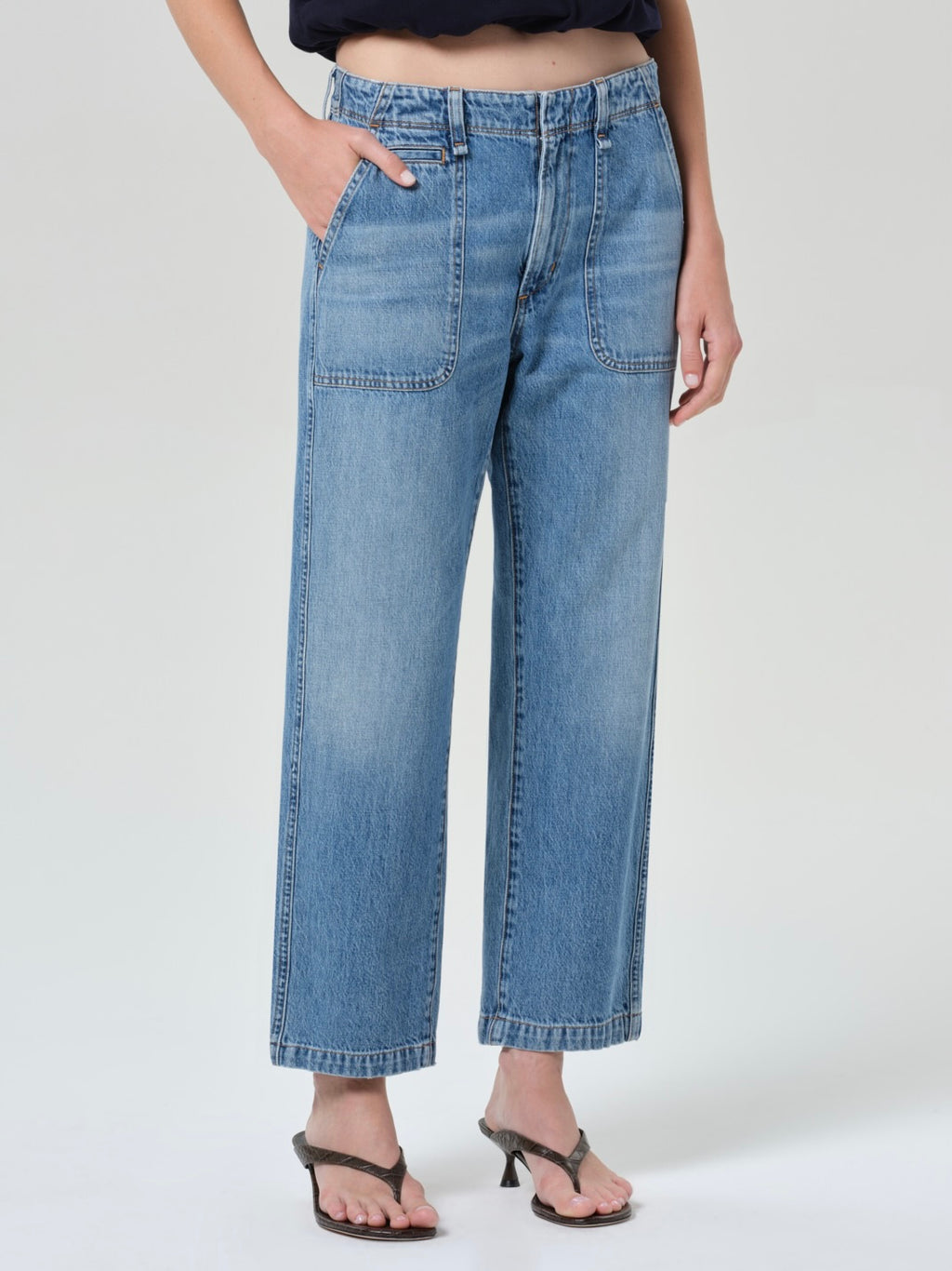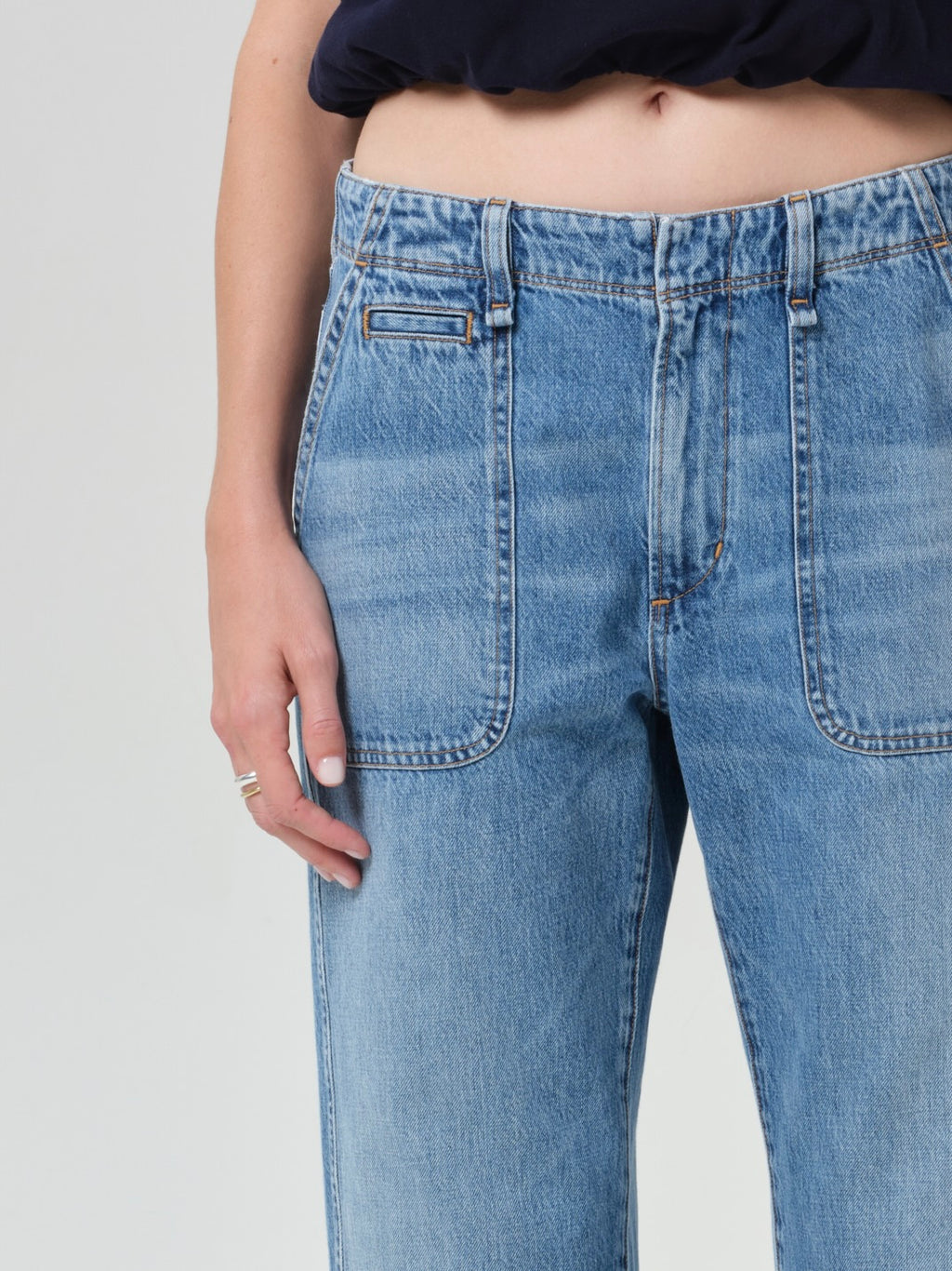 Light to medium indigo denim utility pant with large front pockets.